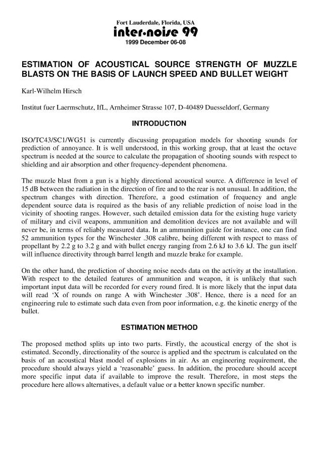 Estimation of acousical source strength of muzzle blasts on the basis of launch speed and bullet weight